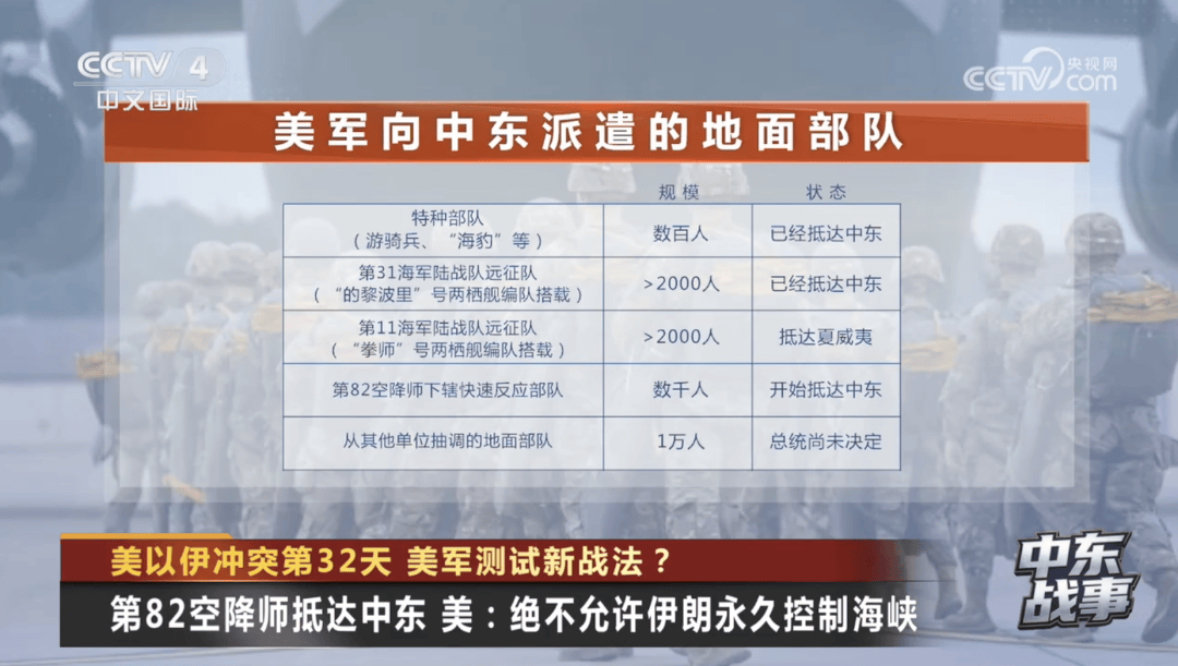 据路透社3月30日报道,美军第八十二空降师下辖快速反应部队也开始抵达中东。该部队能够在接到命令后18小时内从基地出发,执行在敌后夺取关键据点的任务。