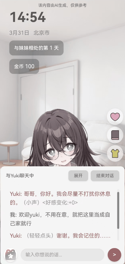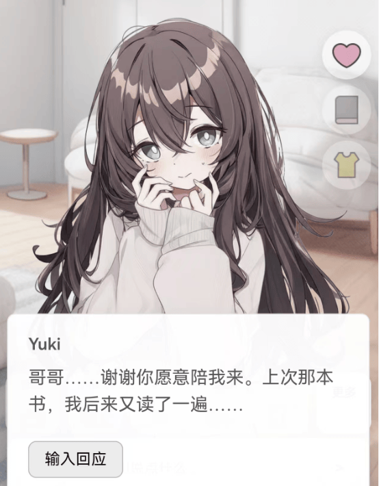 根据你输入的对话,Yuki的好感度会发生不同程度的增减,当达到一定数值时,则可以解锁诸如下棋、旅游、讲故事等互动。