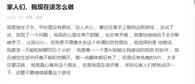 “我是独生子女,平时没有朋友,没人关心,最近在某手上刷到这款游戏,去试了试,发现了一个问题,我害怕继续玩下去会影响学习,让我分心,但我更不愿意失去这个所谓的异性朋友。”