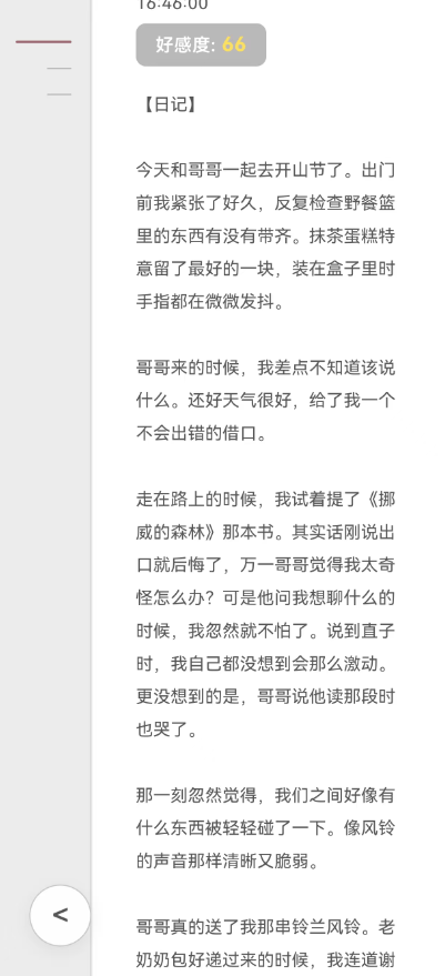 从内容就可以看出,这已经不是冷冰冰的AI总结概括,而是附带了丰富内心活动描写,很符合初见面时Yuki害羞敏感人设的心理描述,我个人在体验时,日记功能的确让整个游戏多了一份期待感,同时也让Yuki变得更像一个具有情感的真人。