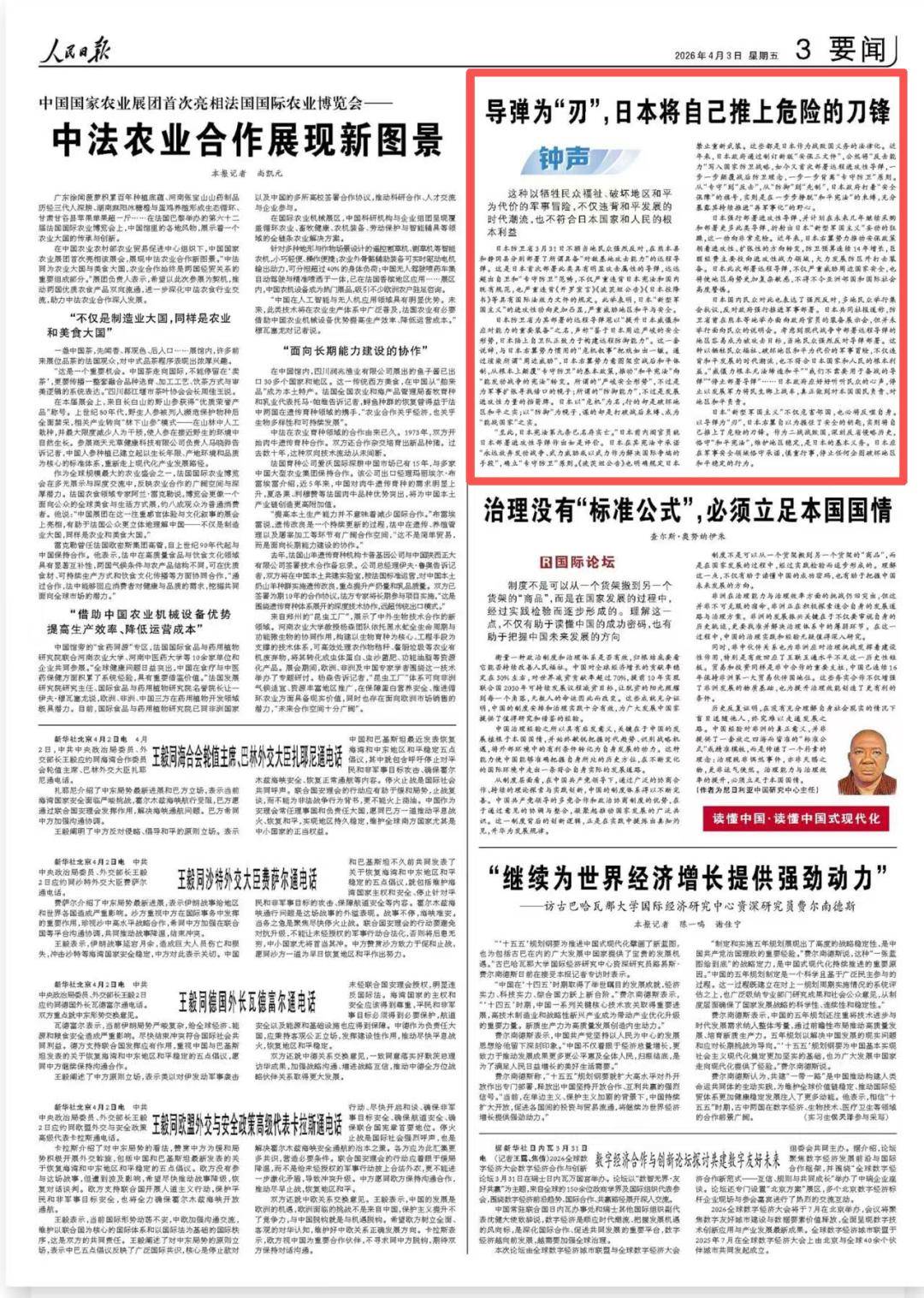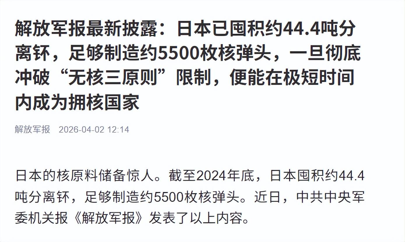 信息来源:上观新闻 2026-04-03、日本撕下“专守防卫”伪装首次部署远程导弹,射程覆盖中国东部沿海;《人民日报》2026-04-03、日本强行部署进攻性导弹并计划继续采购和部署更多,这一动向非常危险;人民网-国际频道 2026-04-03、意欲打造“导弹列岛” 日本或将自食恶果;《解放军报》2026-04-02、披露日本已囤积约44.4吨分离钚,足够制造约5500枚核弹头,一旦突破“无核三原则”,将迅速成为拥核国家。