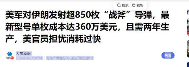 短短四周时间,美军发射了超过850枚“战斧”巡航导弹,几乎耗空了中东战区的库存,还成了伊朗低成本拖垮美国的“完美教材”。