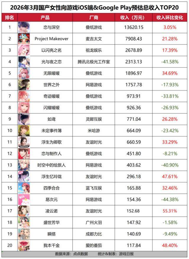 2026年3月,国产女性向手游iOS端(AppStore及Google pay)收入TOP20超半数产品呈收入环比下降趋势,主要是由于部分游戏在2月进行新春版本或较大版本更新,3月自然回落。同时,也有《无限暖暖》《以闪亮之名》《如鸢》《浮生忆玲珑》等部分产品进行了多项卡池和常规活动更新,实现收入环比增长。