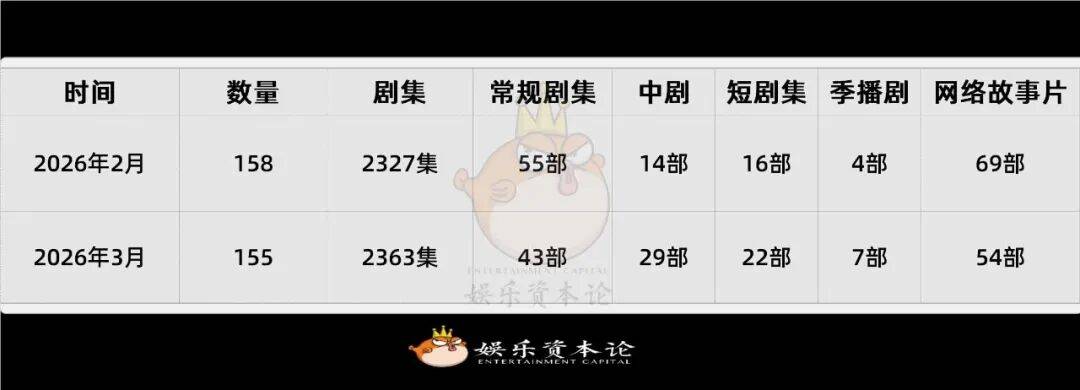 国家广播电视总局今日发布2026年3月全国拍摄制作电视剧(网络剧)备案公示,本月共备案150 部,较 2 月微降 5.1%。从数据结构看,尽管长剧产能保持平稳,但“短剧集”与“网络故事片”的占比显著提升,说明行业正在从单纯的“长视频争夺”转向“长短结合”的全域视频内容生产。剧本储备目前处于去库存后的精品化迭代期,盲目立项减少,题材更加垂直。