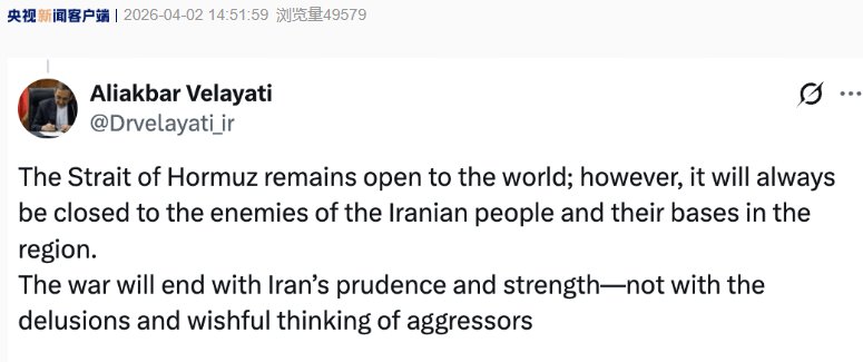 据央视新闻报道,当地时间4月2日,伊朗最高领袖外事顾问、前外长韦拉亚提在其个人社交媒体平台账号上表示,霍尔木兹海峡对世界开放,但对伊朗人民的敌人及其在该地区的据点将永远关闭。