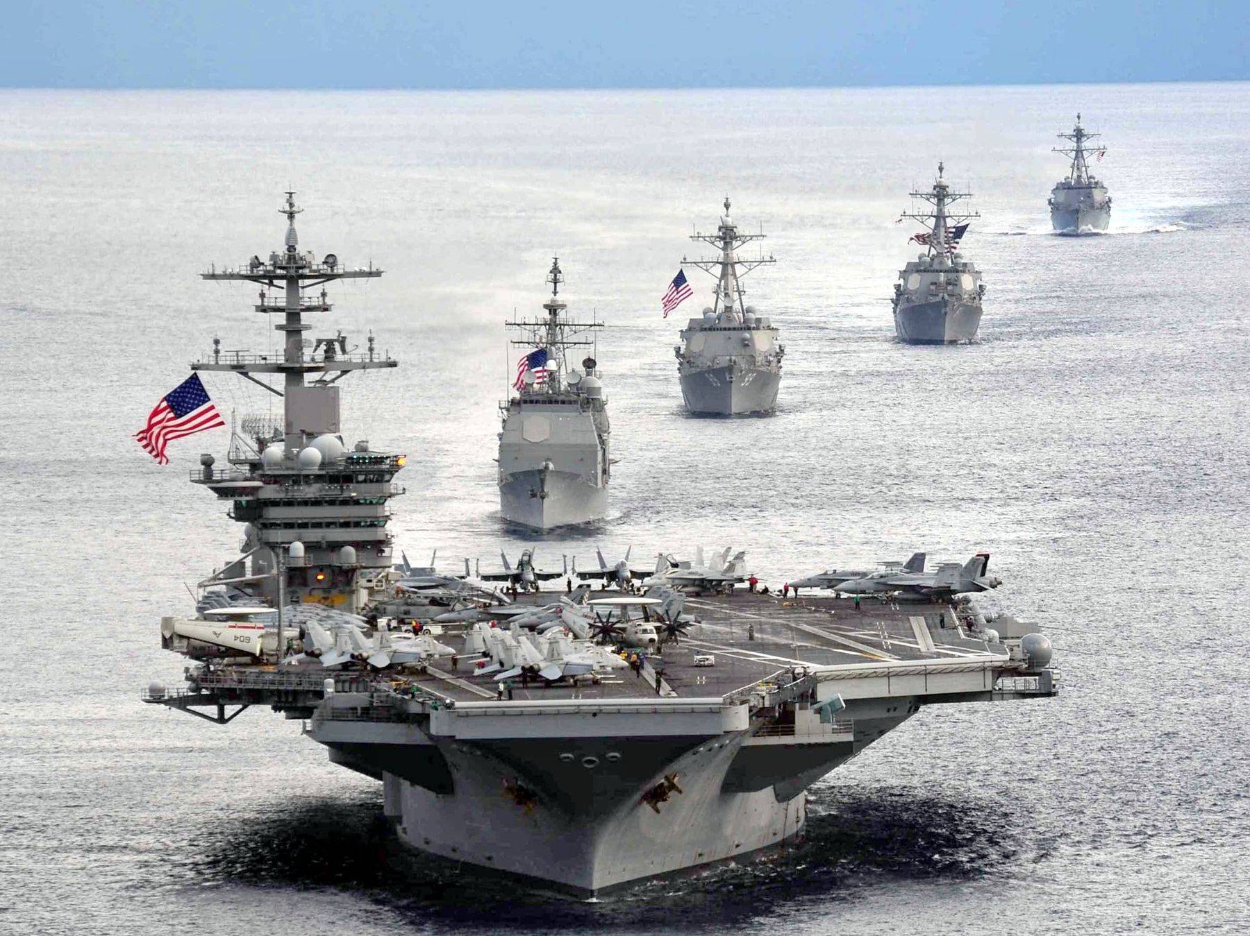 但要知道,美军的航母,从来不是自己独来独往的,一个航母打击群的标配组成如下: