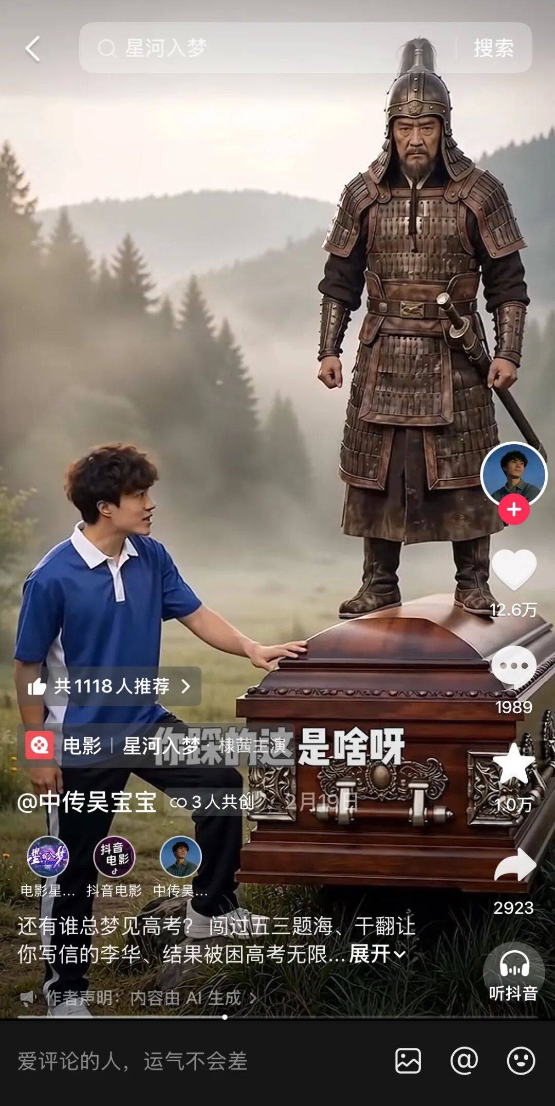 其实平台已经撮合了很多创作者与影视综创作者的交流,《那根棍子》的创作者@老布褶也分享了现场趣事,“吴京拍完之后并没有走,鼓励我们放开了玩,特别支持我们这次合作。而且我发现好几位演员早就看过我们的账号了,这种感觉太奇妙了,一个抖音创作者,永远不知道到底哪些人藏在粉丝数那串茫茫的数字里,被看见的感觉真好。”@中传吴宝宝也与《星河入梦》导演韩延就“电影创作和AI”进行深度对谈。