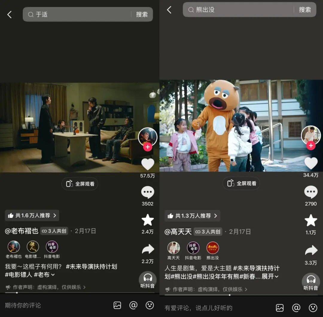 平台的撮合下,不少优秀创作者与资深内容人基于IP共创、交流,《那根棍子》就是由@老布褶也 导演,吴京、于适、熊瑾怡、林秋楠共同出演,延续阐述《镖人:风起大漠》中江湖道义的短片;《爷出没之和孙女的第一面》则是@高天天 基于用户对于熊出没IP情怀的精进创作。