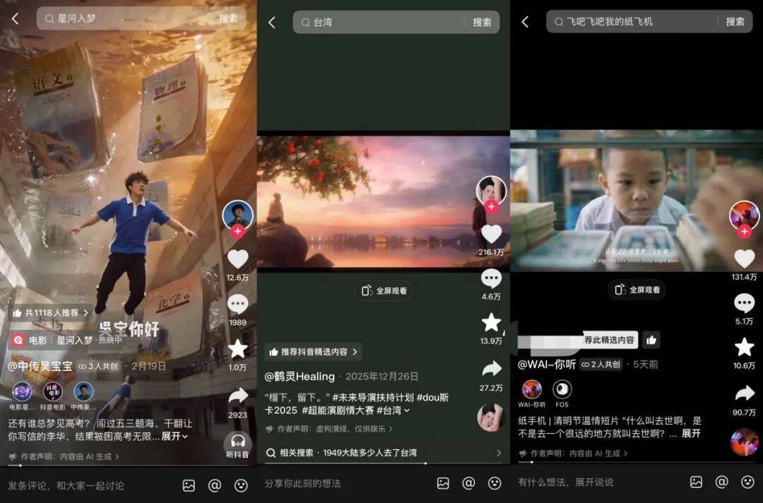 创作者们的反馈充分说明,平台动作正在前置化激发创作。“一个小镇女孩,有一天竟然能靠自己喜欢的这样一件纯粹小事,通过‘未来导演扶持计划’的传播,被这么多人看见和喜欢,我非常触动,真的要敢于编织自己的人生之梦。”,@鹤灵Healing感慨道。“感谢抖音,能够听到我们这些创作者敲击键盘的声音”,@老布褶也也如此表示。