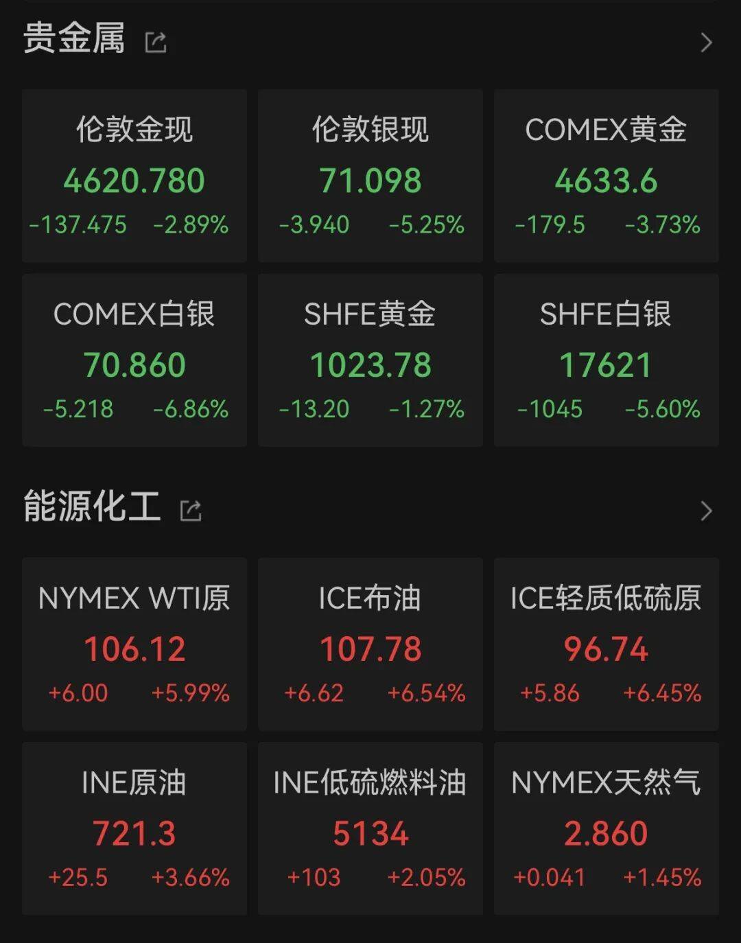 NYMEX WTI原油上涨5.99%,报106.12美元/桶;ICE布油上涨6.54%,报107.78美元/桶。